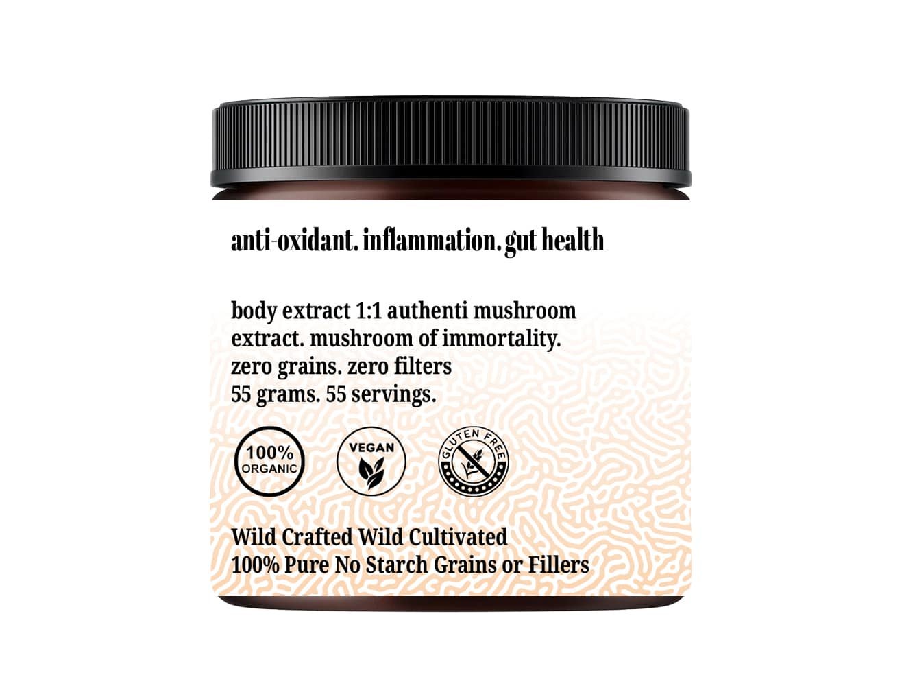 Chaga, the mushroom of immortality, is used in functional medicine to boost immune system, reduce inflammation, and mitigate oxidative stress. Chaga is shown to strengthen beneficial cytokines while reducing damaging cytokines such as TNF-a (Tumor Necrosis Factor – alpha). This immunomodulating effect improves the body’s ability to fight pathogens while reducing the damaging effects of acute and chronic inflammation. Chaga’s high fiber and antioxidant properties are especially helpful in improving conditions of the gut.